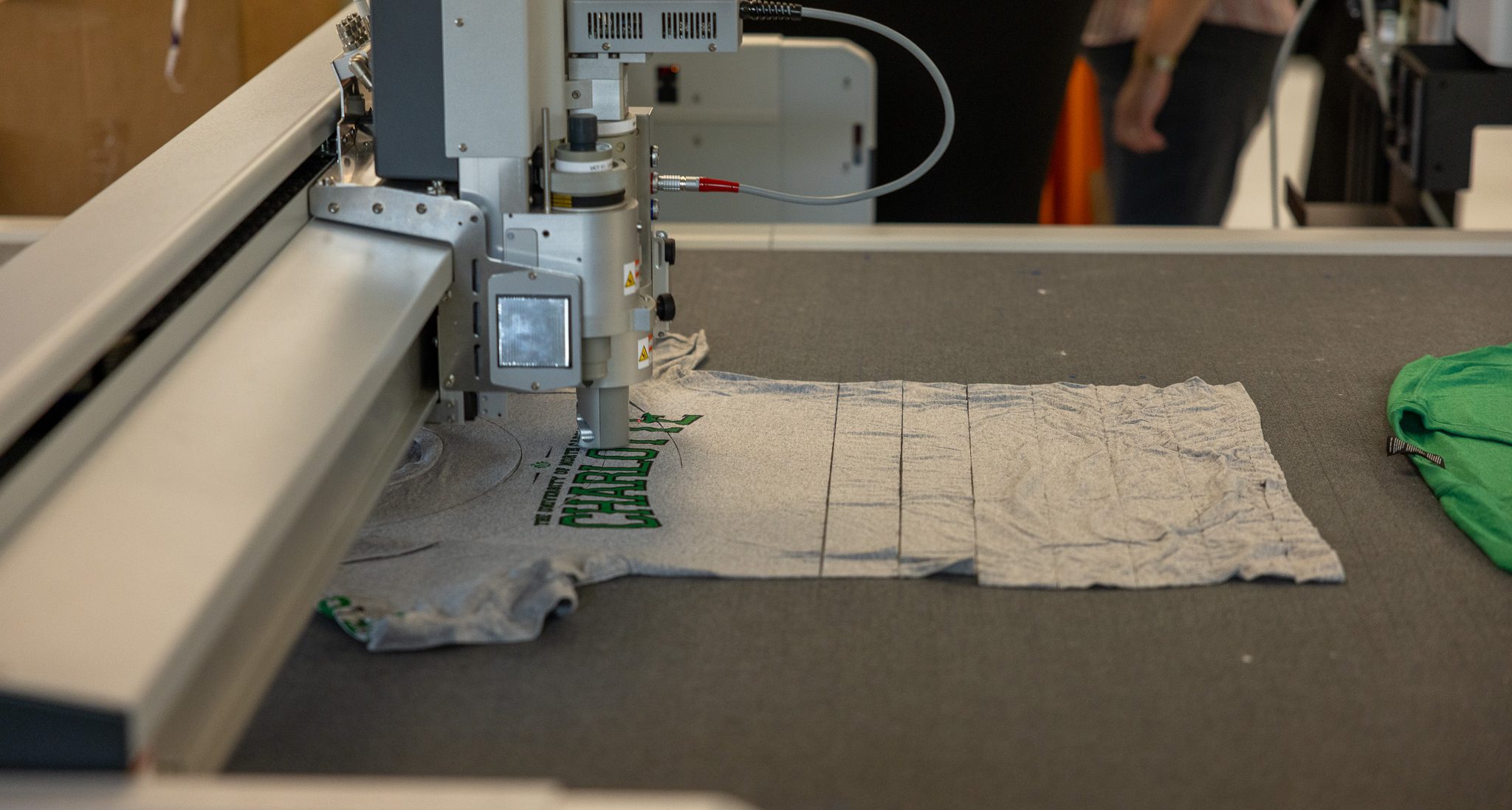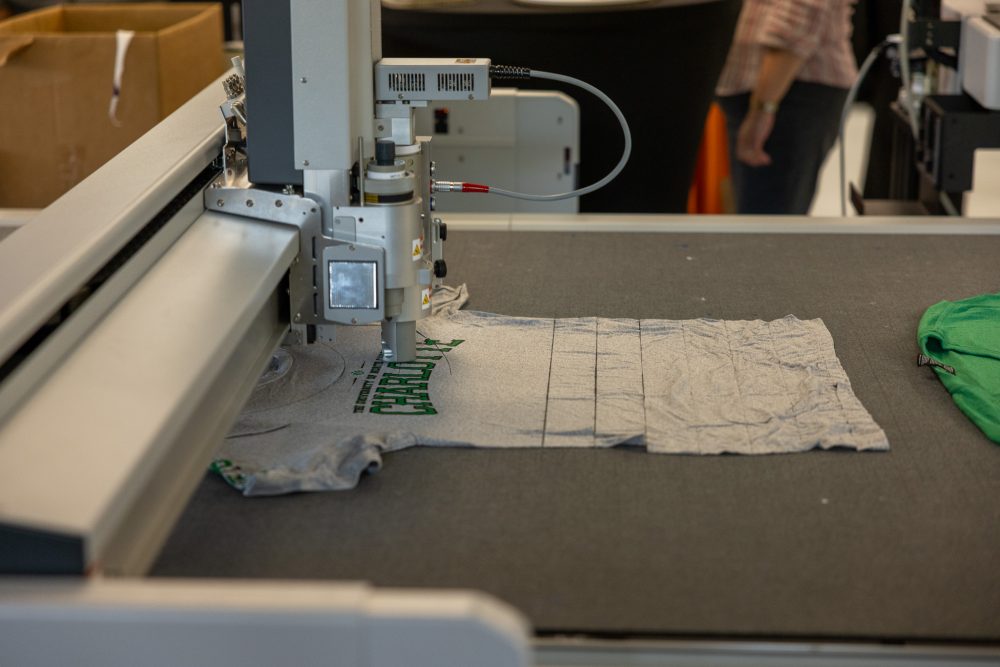 The Super Fab Lab partnered with Innovation Barn to cut recycled T-shirts and make cat beds out of them. This primarily used the Zund open format cutter which makes loading and cutting shirts quick and easy.